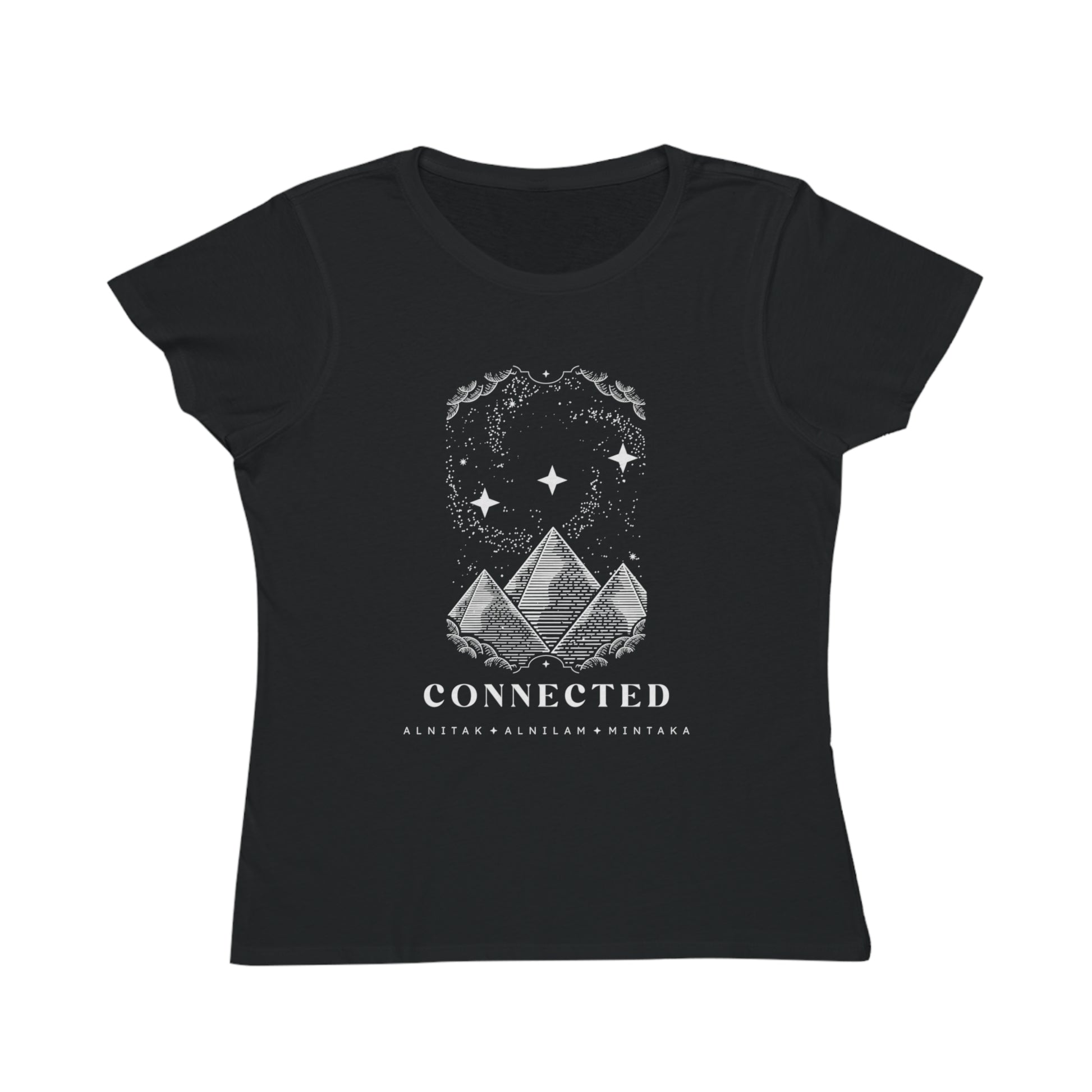 ✨ This isn't just a tee; it's a hug from the cosmos, wrapped in the softest 100% certified organic cotton you've ever felt. Seriously, it's so breathable, you might just float! Printed with eco-friendly inks (because even galaxies appreciate a clean footprint!), this shirt proudly displays three powerful pyramids perfectly aligned with the dazzling three stars of Orion's Belt. And below it all, the word 'Connected' – because, you are!